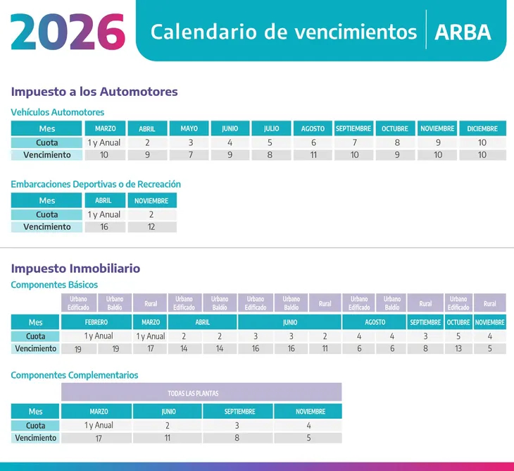 Vencimientos 2026 de ARBA El calendario de vencimientos para 2026 del impuesto inmobiliario establece las fechas en que los contribuyentes deberán abonar sus cuotas para evitar multas e intereses.